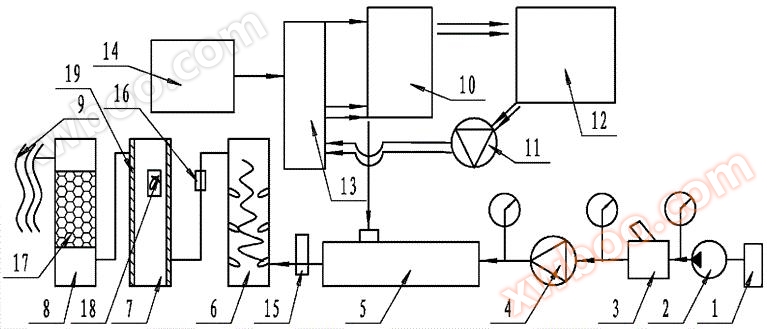 1) apa care trebuie tratată; 2. pompă de apă; 3, supape de siguranță; 4, prima supapă de flux; 5. difuzorul; 6. amestecător; 7, rezervor de reacție fotocatalizator; 8, rezervoare de oxidare catalizatoare; 9. tratarea apei; 10. generatoare de ozon; 11, a doua valvă de flux; 12. mașini de răcire; 13. rezervoare uscate la rece; 14. producător de oxigen; 15. pompă de presiune; 16, supapa de ordine; 17, stratul de oxid de aluminiu; 18. lumină violetă; 19, stratul de dioxid de titan.